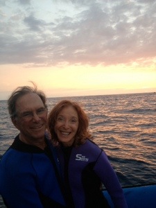 Before swimming with the manta rays on the Big Island of Hawaii, Joel and I are enjoying a multi-colored sunset from the deck of a boat which just dropped anchor a short distance from shore. Pretty ideal, huh? Well, read on…