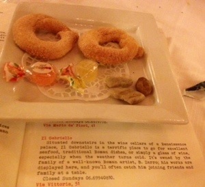 Our evening ended with the traditional after dinner cookies and candies. You’ll notice 3 rocks on the small plate. Three rocks are placed on each table in lieu of flowers to represent the three passions of Rome: wine, food and love. When I asked which rock represented “love”, our grinning server responded: “the biggest”!