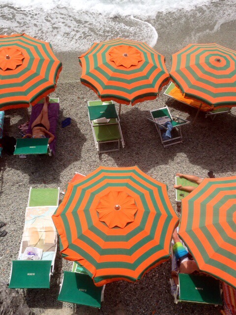 Don’t know what is more beautiful: that azure ocean, the kaleidoscope of orange popsicle umbrellas, or those water-colored buildings resting against the mountains.